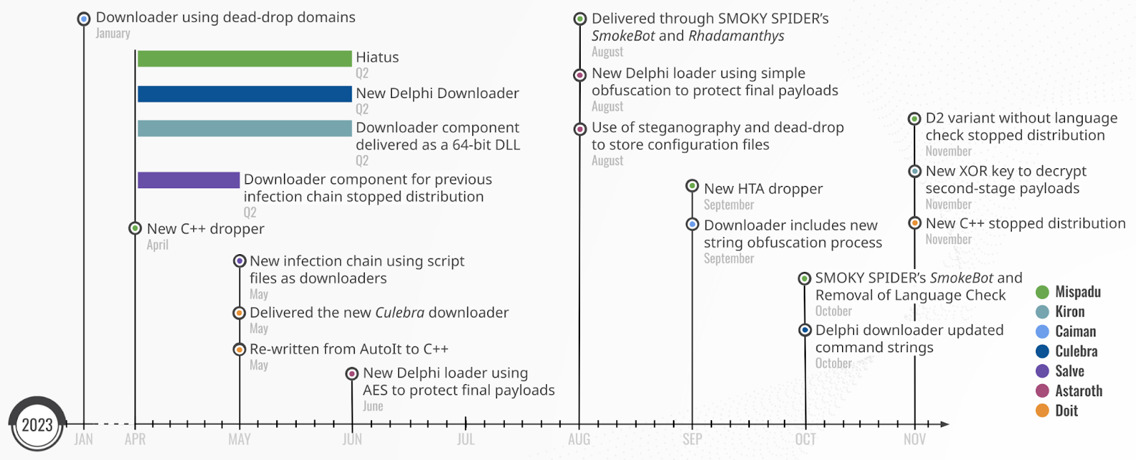 In Q2 2023, Kiron used 64-bit DLL downloaders; the malware previously only used 32-bit DLLs. Using 64-bit payloads is uncommon for this type of malware. In 2023, we also observed notable activity for another threat — which we track as Caiman (also referred to as Grandoreiro in public reporting) — distributed at a lower rate than Kiron (in terms of the number of samples).