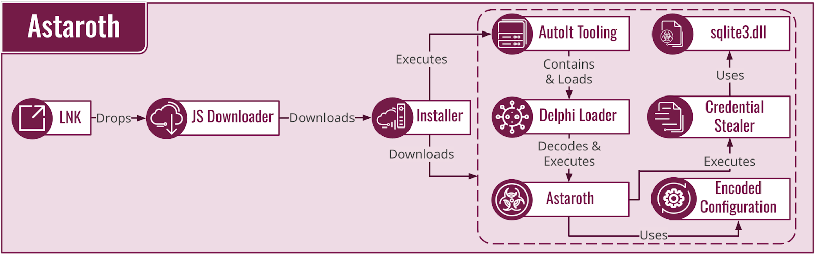 Astaroth is delivered in a long deployment chain (Figure 13). The Astaroth downloader grabs an installer that retrieves other components: AutoIt tooling, a configuration file, an encrypted Astaroth payload, a copy of the legitimate sqlite3.dll and a credential stealer.