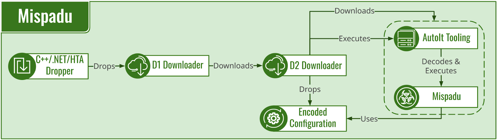 Two other dropper variants were also identified: another C++ variant that uses string obfuscation and a .NET variant. The C++ variant uses an algorithm dubbed E1 that encodes configuration files managed by the Mispadu D2 downloader. The .NET variant implements string obfuscation with AES-256 in CBC mode.
