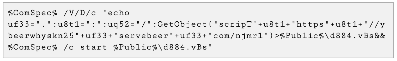 The dropper runs a command line (Figure 4) that drops a VBS file — a Mispadu D1 downloader — to disk.