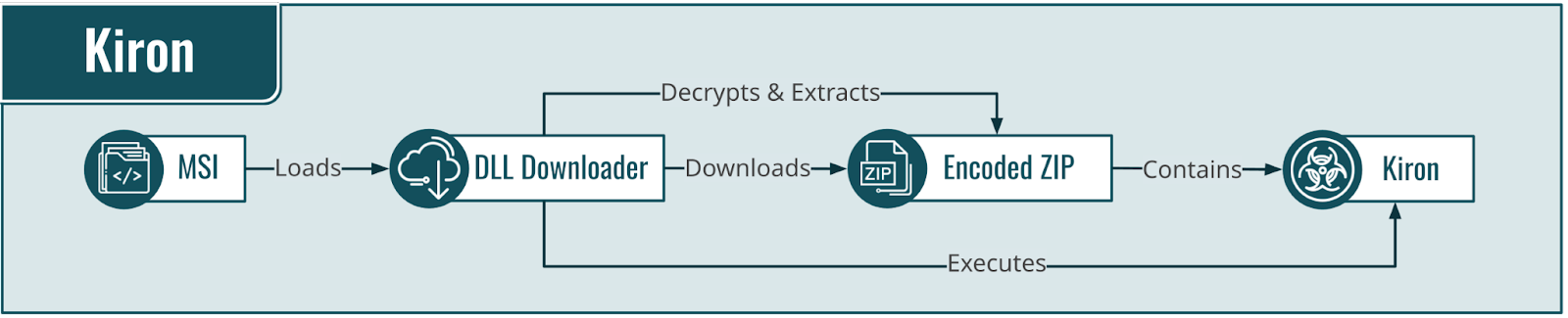 Kiron (aka Grandoreiro) is likely one of the most active LATAM malware families, exhibiting a high volume of samples during 2023. Kiron is composed of two components: a downloader and a payload. The downloader retrieves an encrypted ZIP file that contains a Kiron payload (Figure 5).