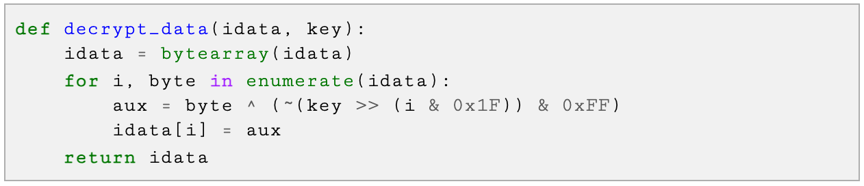 Figure 6 contains a code snippet in Python that re-implements the Kiron decryption process to decrypt the downloaded ZIP files. Though the malware has historically used the XOR key 0x161a, it began using the key 0x19a9 in November 2023.
