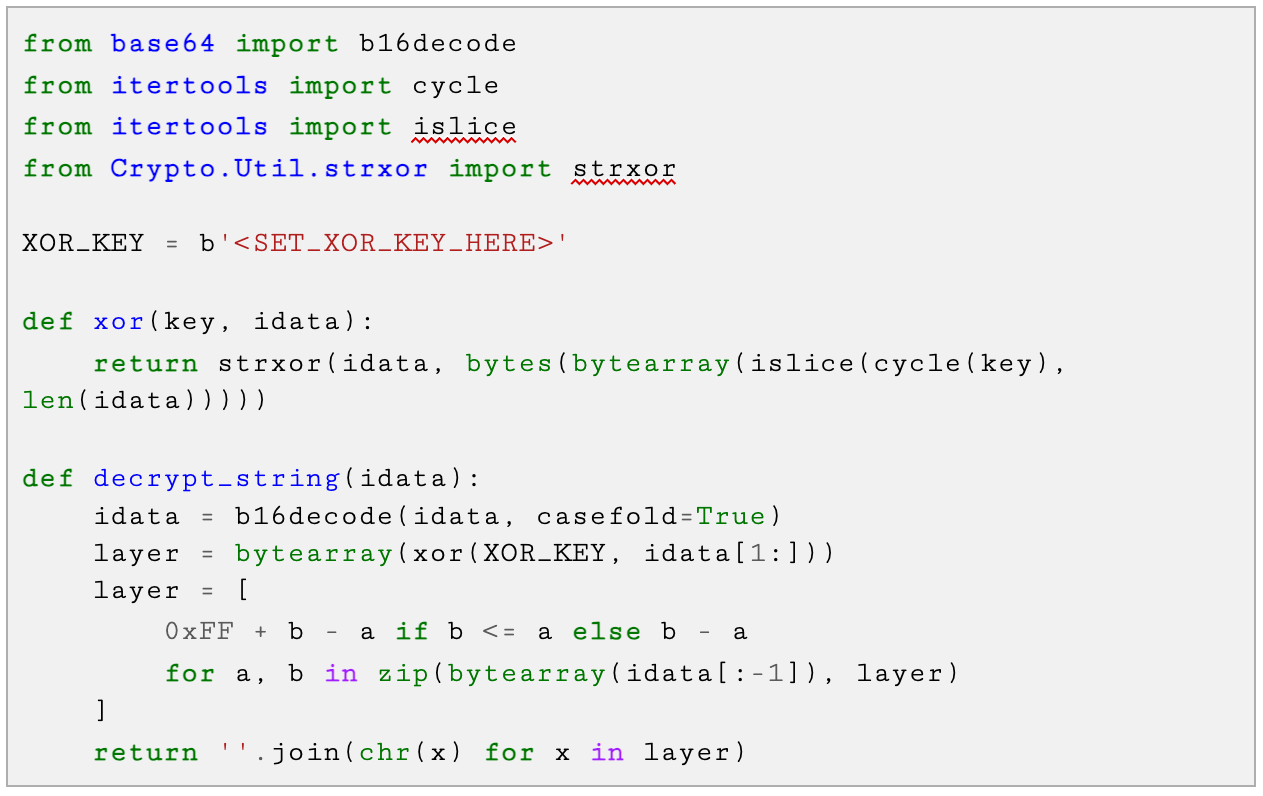 - String encryption: Most of the analyzed threats use the same XOR-based algorithm to encrypt strings as an anti-analysis technique to hinder static analysis. Depending on the malware family, additional layers of obfuscation have been implemented (the Python re-implementation for the XOR algorithm is attached in the Appendix).